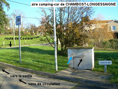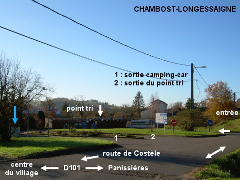 L'aire pour camping-car (fléchée) est situé à 70 mètres de la D101 en direction de Panissières. 1) En provenance de Panissières sur la D27 qui devient D101 (en changeant de département), juste après le panneau de début de village tourner à droite en suivant le panneau fléché de l'aire pour camping-car. Celle-ci est implantée côté gauche un peu plus loin et la circulation se fait en sens unique sur le demi cercle qui dessert d'abord un point tri (il y a d'abord les deux sorties, la première étant celle pour camping-car puisque l'aire service est à 10 mètres de la route). Les deux robinets, fixés sur un pan de mur (à droite avant la sortie) sont reliés à la même arrivée d'eau et délivrent donc de l'eau potable (pas uniquement celui qui est fileté). 2) En provenance de Saint-Clément-les-Places sur la D101, peu avant le village celle-ci se superpose à la D7 puis au rond-point tourner à droite en direction du bourg dans la suite de la D101. Monter jusqu'au centre du village (bande cyclable dans le sens de la montée) puis au carrefour à droite avec la D27 venant de Villechenève continuer tout droit dans la D101 direction Panissières. Puis tourner dans la première à gauche en suivant la flèche pour camping-car. Ensuite entrer à gauche sur l'aire pour camping-car (à vélo, on n'est pas obligé de faire le tour en passant par l'entrée plus loin, on peut aller directement vers les robinets qui ne sont qu'à 10 mètres de la route).