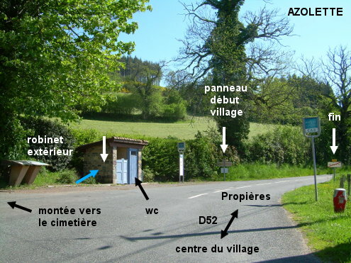 Le petit bâtiment des toilettes est implanté côté gauche à la sortie du village sur la D52 direction Propières, juste avant le panneau de fin de village, et à côté d'un arrêt de car. Le robinet est à l'extérieur sur le côté gauche du bâtiment.