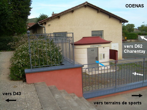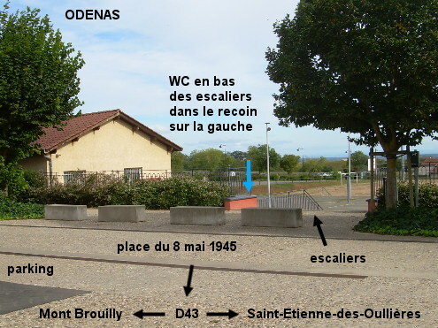 Ces toilettes (loin de la route mais fléchées) se trouvent entre un parking situé au bord de la D43 et des terrains de sports situés au bord de la D62 direction Charentay. 1) Sur la D43 en provenance de Saint-Etienne-des-Oullières, après le rond-point avec la D62 venant de Saint-Etienne-la-Varenne (situé juste avant le début du village), vers le centre du village on verra de part et d'autre de la route deux grandes places avec parking, et côté gauche une série de panneaux rougeâtres concernant les commerces et services du village. Entrer alors sur le parking côté droit (il y a un pictogramme fléché signalant les toilettes) juste après le passage piéton (N.B. : La borne Bayard à droite au coin est hors service). Se diriger vers le fond du parking (40 mètres), descendre les escaliers (douze marches) pour trouver en bas dans le recoin à gauche la cabine ovoïde des toilettes à nettoyage automatique. N.B. : Il faut insister longuement et très haut un peu à gauche de la buse d'écoulement pour activer la cellule à détection qui commande l'eau. 2) Sur la D62 en provenance de Charentay, peu après le début du village, tout à la fin de la longue série de terrains de sports à gauche, traverser pour entrer par le portail ouvert (il y a un pictogramme WC fléché orienté face à l'autre sens de circulation) et se diriger vers le fond et vers la droite pour trouver la cabine WC au pied des escaliers qui montent vers la place du 8 mai 1945.