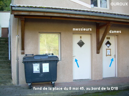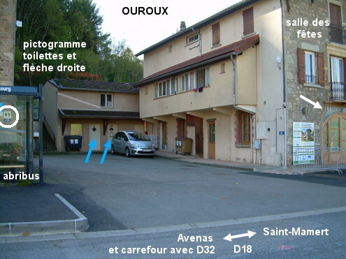 Ces toilettes se trouvent à gauche de la salle des fêtes sise au bord de la D18 qui traverse le village et à proximité du carrefour avec la D32 direction Fleurie. Sur la D18 en provenance d'Avenas, après l'intersection avec la D32 venant à gauche du col de Crie et la D32E à droite, juste après le carrefour à droite avec l'autre partie de la D32 venant du col de Fontmartin et de Fleurie, on verra d'abord côté gauche très en retrait une porte avec le pictogramme masculin : il n'y a que des urinoirs, sans lavabo ni robinet. Il faut continuer quelques mètres sur la D18 puis, toujours côté gauche, après l'abribus et avant le bâtiment dont la porte est surmontée de la mention ''salle des fêtes'' entrer sur la placette et aller au fond (20 mètres) pour trouver les portes des toilettes en deux parties, chacune équipée d'un grand évier rectangulaire avec deux robinets.