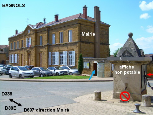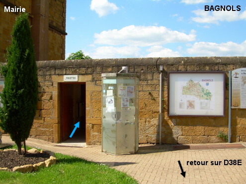 Les toilettes se trouvent à droite de la Mairie sise en retrait derrière un grand parking au bord de la D38E, et non loin de l'église. N.B. : Les deux lavabos sont trop petits pour remplir un bidon (on peut néanmoins se désaltérer en cas de panne sèche). En provenance de Moiré sur la D607 puis la D38E, au carrefour en Y prendre la branche gauche pour passer ensuite à côté de l'église puis au carrefour en T tourner à droite (suite de la D38E), on arrivera alors vers la Mairie juste après une rue adjacente à droite. L'entrée des toilettes se trouve dans le mur à droite du bâtiment de la Mairie, près de cette rue. N.B. : Dans l'angle avant ce ''chemin de la Pompe'' on remarquera le cabanon en pierre d'une ancienne pompe sur laquelle un bouton-poussoir a été installé côté D38E au-dessus de la buse d'écoulement de l'eau. ATTENTION : Ne pas boire de cette eau signalée non-potable ! L'affiche est apposée (au mois de mai 2025) non pas au-dessus du bouton et de la buse, mais sur le côté droit du cabanon cubique.