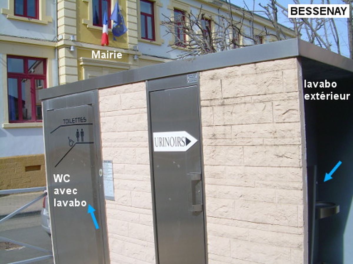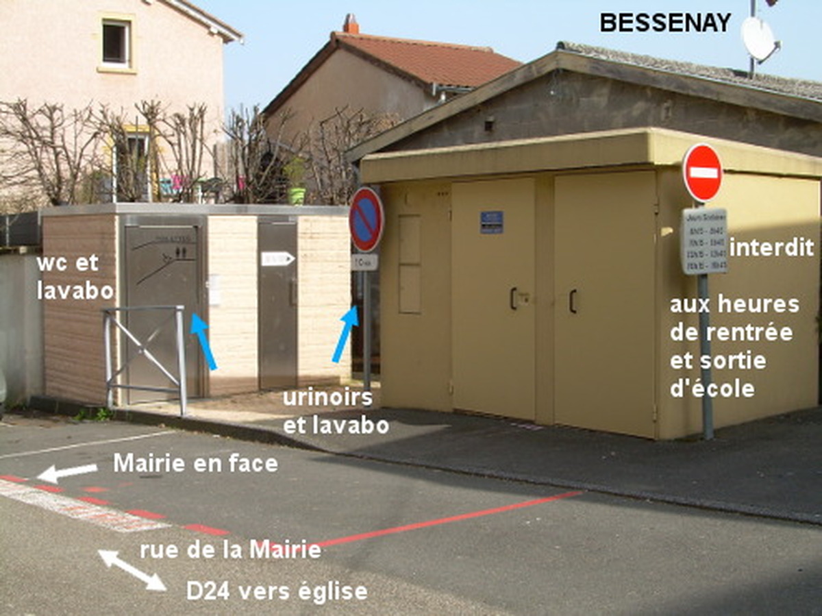 Ces toilettes (fléchées) se trouvent en face de la Mairie sise dans une rue secondaire, et à 70 mètres de la D24. Il s'agit d'une cabine WC autonettoyante concernée par une fermeture nocturne de 22h à 6h et dotée d'un grand lavabo-boite tri-fonction avec cellule à détection pour la commande de l'écoulement de l'eau. N.B. : Il y a aussi à l'extérieur sur le côté droit (entre la cabine WC et le mur) deux urinoirs et un lavabo avec robinet à bouton-poussoir. 1) En provenance du lieu-dit La Brévenne sur la D24, juste après l'église érigée côté droit et avant la grande place tourner à droite en suivant la flèche et le pictogramme indiquant les toilettes. Quelques mètres après on verra le petit bâtiment des toilettes face à soi sur le trottoir côté droit et presque en face de la Mairie sise côté gauche. 2) En provenance de Montrottier sur la D24, au carrefour en T avec la D81E qui arrive à droite de Brullioles, tourner à gauche dans la suite de la D24. Après la longue place côté gauche et avant l'église dont on aperçoit le clocher, tourner à gauche pour prendre la rue avec un sens interdit aux heures de rentrée/sortie d'école puis rouler encore 70 mètres jusqu'aux toilettes côté droit.