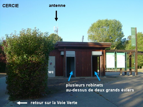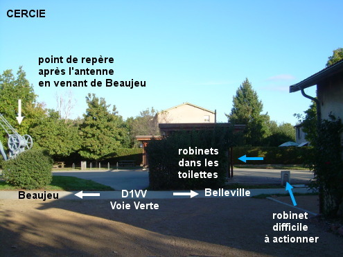 Ces toilettes se trouvent sur le ''point vélo'' de la Voie Verte situé à proximité de son intersection avec la D68 direction Villié-Morgon. 1) Sur la Voie Verte du Beaujolais qui relie Belleville-en-Beaujolais à Beaujeu, peu après le panneau marquant le début du village (présent aussi sur la Voie Verte) et juste après la traversée de route (qui est la D68), entrer à droite dans la zone du ''point vélo'' avant la haie plantée entre la Voie Verte et le bâtiment des toilettes. Dans celui-ci on trouvera deux grands éviers avec plusieurs robinets, qui sont beaucoup plus faciles à actionner que le robinet implanté au-dessus d'une vasque directement au bord de la Voie Verte après le début de la haie précitée. 2) Dans l'autre sens sur la Voie Verte (en provenance de Beaujeu), après le panneau de début de village et le point kilométrique 6,8 de la Voie Verte, après une antenne-relais puis une ancienne grue-treuil servant de points de repère, entrer à gauche dans la zone du ''point vélo'' (l'entrée des toilettes est orientée face au sens opposé). 3) Sur la D68 en provenance de Saint-Lager, environ 250 mètres après la traversée de la D337, tourner à gauche dans la Voie Verte (juste après le magasin de motoculture) pour trouver peu après côté droit le ''point vélo'' et ses toilettes. 4) Sur la D68 en provenance de Villié-Morgon, environ 170 mètres après le panneau de début de village (et juste après l'impasse des Vrilles donnant dans un parking), tourner à droite dans la Voie Verte pour accéder peu après aux toilettes du ''point vélo'' (en face d'un bâtiment à la façade recouverte d'une fresque peinte, situé de l'autre côté de la Voie Verte).