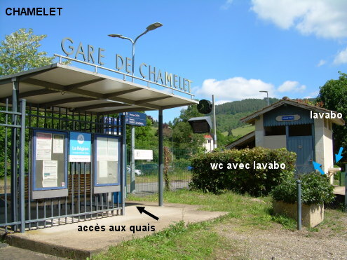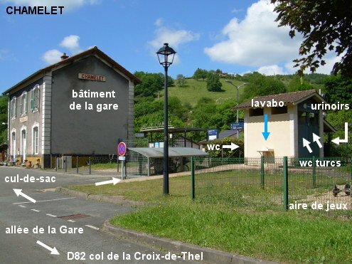 Ces toilettes se trouvent à côté de la gare SNCF (toutes deux fléchées) qui est située non loin du passage à niveau sur la D82 et du carrefour D82 / D385. 1) En provenance du col de la Croix-de-Thel sur la D82, juste avant le panneau de début de village et après le passage à niveau, tourner à droite (les flèches ''parking gare'' et ''toilettes publiques'' sont orientées face au sens inverse). Après une aire de jeux côté droit et avant l'accès aux quais et le bâtiment de la gare, prendre le plan incliné en faux pat conduisant au petit bâtiment des toilettes. Sur sa face avant il y a un lavabo extérieur. N.B. : Il y a aussi un lavabo à l'intérieur de la cabine WC accessible aux handicapés située sur le côté gauche, mais pas dans les deux cabines WC turcs situées sur le côté droit. Il y a en outre des urinoirs derrière un paravent sur la face arrière du bâtiment côté voie ferrée. 2) En provenance du col du Joncin sur la D116 puis la D157, après avoir traversé tout le centre du village, au carrefour avec la D385 à très grande circulation, tourner à droite et 200 mètres plus loin tourner à gauche en direction de Dième dans la D82. Peu après et juste avant le passage à niveau, tourner à gauche en direction de la gare et des toilettes (les flèches sont en retrait côté gauche).