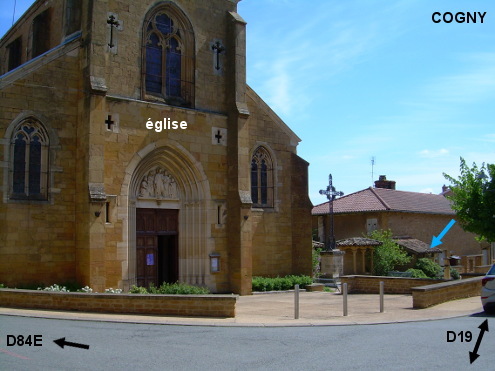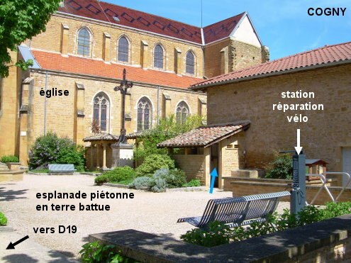 Le petit bâtiment des toilettes se trouve au fond d'une esplanade piétonne située à droite de l'église érigée dans l'angle du carrefour D84E / D19. 1) Sur la D19 en provenance de Saint-Julien, au carrefour à gauche avec la D84E venant de Lacenas derrière lequel est érigée l'église côté gauche, traverser en diagonale jusqu'au parvis de l'église puis parcourir quelques mètres à pied sur le trottoir pour rejoindre de plain-pied l'esplanade en terre battue qui est à droite de l'église. On trouvera le petit bâtiment des toilettes au fond accolé à un grand bâtiment. N.B.1 : Le robinet est à droite des urinoirs et relativement bas (près du sol). N.B.2 : Il y a sur la droite de cette esplanade une station réparation vélo en libre service (support atelier, pompe et divers outils). 2) Sur la D19 en provenance de Ville-sur-Jarnioux, lorsque l'on aperçoit au loin l'église érigée côté droit, peu après une rue adjacente à droite et un passage piéton, mettre pied à terre pour entrer sur la placette piétonne à droite et accéder aux toilettes.
