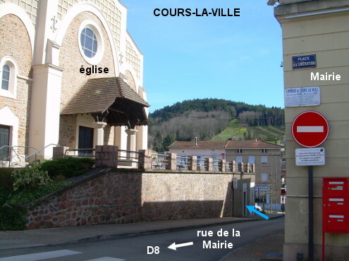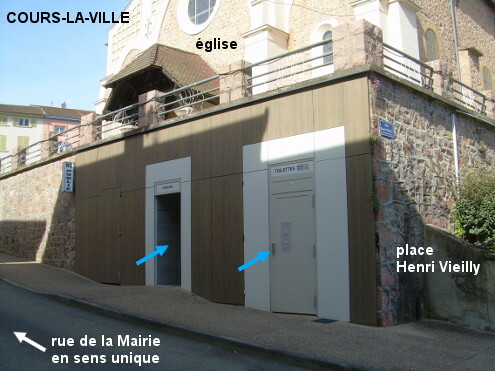 Les toilettes se trouvent dans la rue entre l'église et la Mairie qui sont situées au bord de la D8 qui traverse le centre-ville. 1) En provenance de Pont-Trambouze sur la D308 puis la D8 en direction du centre-ville, longtemps après le panneau marquant le début de la ville, juste après la Mairie sise côté droit et avant l'église érigée côté droit, prendre la rue à droite. Elle est en sens interdit mais il n'y a que 30 mètres à faire à pied jusqu'aux toilettes dont les entrées sont à gauche dans le mur de soutènement de la place sur laquelle est érigée l'église. Chaque partie des toilettes dispose d'un grand lavabo-boite muni d'une cellule à détection pour la commande de l'écoulement de l'eau. N.B. : Il faut vraiment insister très près de la cellule pour celui qui est dans la cabine WC auto-nettoyante. 2) En provenance de Mardore sur la D56, peu après être passé à côté d'un square situé à droite, au carrefour où une flèche pointe Madore dans la direction d'où l'on vient, tourner à gauche (c'est la D8) puis peu après prendre à gauche la rue après l'église pour trouver les toilettes. 3) Sur la D8 en provenance du col de la Bûche, au carrefour avec la D308 suivre à gauche la direction du centre-ville, continuer tout droit au carrefour à gauche avec la D64 venant du Thel, continuer encore tout droit jusqu'à l'église érigée côté gauche puis idem ci-dessus. 4) En provenance du col de la Croix Couverte sur la D70 qui devient D64, après le carrefour à droite avec la D64E venant de Sévelinges puis le carrefour à gauche avec la suite de la D64E (D48) en direction du Cergne (le panneau n'est pas visible dans ce sens), au rond-point avec la D308 continuer tout droit puis tourner à droite en direction du centre-ville. Aux feux tricolores, tourner à gauche (c'est la D8) et continuer jusqu'à la Mairie puis idem point 1.