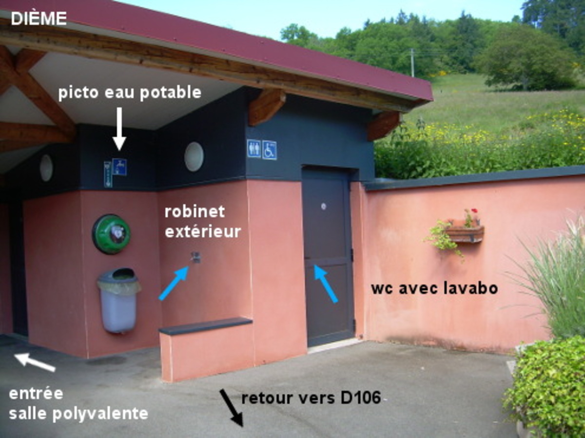 Les toilettes se trouvent dans le même bâtiment que la salle des fêtes (fléchée), lui-même au fond de la place qui est devant la Mairie sise à l'angle de la D106, et qui est en face de l'église. 1) En provenance de Dareizé sur la D31 puis la D313 (à grande circulation mais avec bande cyclable sur le côté) et enfin la D106, quand on verra l'église érigée côté droit entrer à gauche sur la place jouxtant la Mairie dont la façade avant fait face au sens opposé de circulation, en suivant la flèche ''toilettes publiques'' (sous celles de la salle polyvalente et de la Mairie). L'entrée des toilettes nous fait alors face, dans le coin arrière droit de la place. N.B. : En plus du lavabo à l'intérieur des toilettes, il y a un robinet extérieur dans le coin abrité à gauche de l'avancée des toilettes et il y a un panneau avec pictogramme signifiant ''eau potable''. 2) En descendant du col de la Croix-de-Thel sur la D106, peu après le panneau de début de village, on verra l'église côté gauche, et la Mairie côté droit qui nous fait face. Entrer sur la place devant la Mairie pour trouver les toilettes au fond à droite sur l'avant du bâtiment de la salle polyvalente.