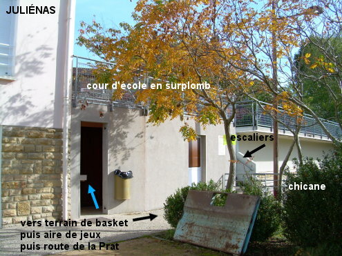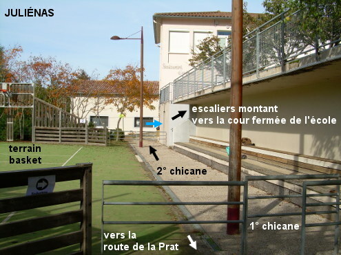 Ces toilettes se trouvent près d'un terrain de basket et d'une aire de jeux, en contrebas de la cour d'une école située au bord de la D17E, à 70 mètres de la route menant à l'aire pour camping-car. N.B.1 : Sur l'allée menant à ces toilettes il y a deux chicanes malaisées à franchir avec un vélo. En provenance de La Chapelle-de-Guinchay sur la D95 qui devient D17, puis sur la D17E, peu après l'église érigée côté droit prendre la branche gauche du carrefour en Y (suivre la flèche avec le pictogramme camping-car) puis entrer aussitôt à droite sur l'allée piétonne asphaltée qui est en contrebas d'une placette avec parking qui est au bord de la D17E. Cette allée est coincée entre le mur de soutènement à droite et une haie arbustive à gauche (qui cache l'aire de jeux) et se termine face au portail de la cour d'école. À gauche de cette allée, on aura rencontré un premier escalier qui descend vers l'aire de jeux, puis un deuxième escalier (avec onze marches). Descendre ce dernier, il y aura alors à gauche l'autre extrémité de l'aire de jeux et à droite l'accès à un terrain de basket. Franchir la chicane à droite (tourner et retourner lentement son vélo dans le sas) pour prendre l'allée qui longe le terrain de basket, ressortir par la deuxième chicane. L'entrée des toilettes est alors immédiatement à droite dans le mur, en contrebas de la cour d'école. N.B.2 : Il est possible de remplir y compris des très grands bidons dans l'évier-lavabo dans l'entrée de ces toilettes.