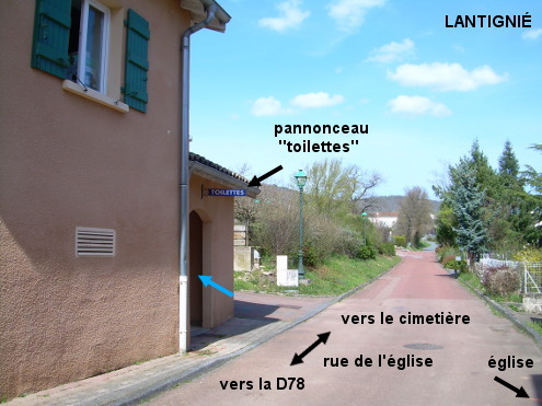 Ces toilettes se trouvent non loin de l'église, à 260 mètres de la D78. Sur la D78 en provenance de Beaujeu, tourner à gauche en direction du centre du village. N.B. : Si on l'aperçoit, ignorer la flèche ''toilettes'' sur la gauche avant la Mairie, elle pointe vers celles de la salle des fêtes dont le lavabo est trop petit. Continuer quelques mètres pour tourner dans la première à droite (suite de la rue de l'église) puis suivre la courbe à gauche. Peu après l'église érigée côté droit, on verra côté gauche l'écriteau perpendiculaire au mur qui signale l'entrée des toilettes (c'est la porte située en face sous la partie abritée). Elles sont dotées d'un grand évier rectangulaire et on peut remplir des très grand bidons.