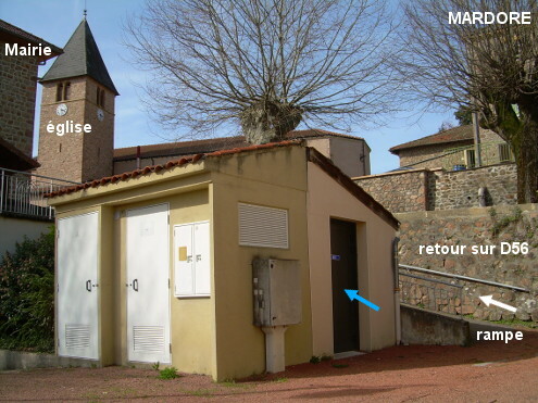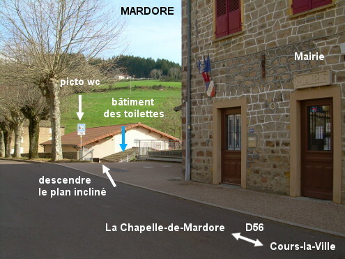 Les toilettes (fléchées) se trouvent en contrebas de la Mairie non loin de l'église au bord de la D56. 1) En provenance de Cours-la-Ville sur la D56, peu après l'église, juste après la Mairie sise côté droit, en suivant la flèche prendre à droite le plan incliné asphalté qui descend vers les toilettes. Le petit bâtiment qui abrite les toilettes est sur la droite, en face du grand bâtiment à gauche (très probablement celui de la salle des fêtes). 2) Sur la D56 en provenance de La Chapelle-de-Mardore, peu après le début du village, à l'entrée d'une courbe à gauche on verra sur la gauche le parking en terre battue de la salle des fêtes, au sortir de cette courbe traverser à gauche avant la Mairie pour accéder facilement aux toilettes.