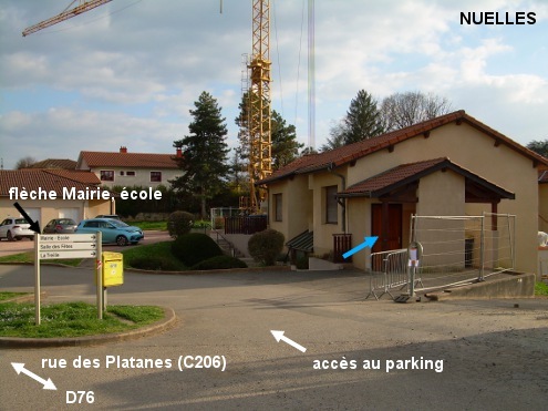 Les toilettes se trouvent au début du parking situé à côté de la Mairie et de l'école (fléchées) et à 145 mètres de la D76. Sur la D76 en provenance de Châtillon-d'Azergues, tourner à gauche dans la voie C206 en direction de ''Nuelles centre''. Un peu plus loin entrer sur la droite sur le parking en suivant la flèche « Mairie - école ». Le petit bâtiment des toilettes est alors sur la droite avant la partie avec les emplacements de stationnement, il est accolé au grand bâtiment de la Mairie (dont l'entrée est orientée côté opposé au sens de circulation et face à l'école située au fond du parking).