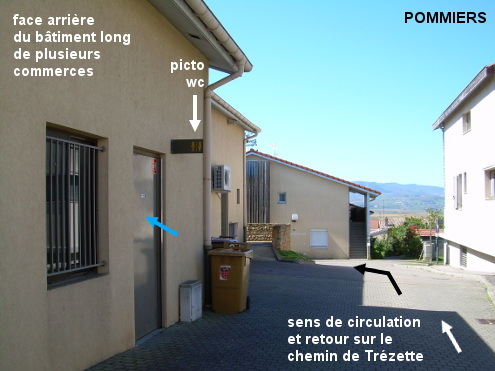 La porte de ces toilettes se trouve sur la façade arrière d'un long bâtiment en L d'un ensemble de commerces comportant une pharmacie, et elle est situé à 110 mètres de la D70. 1) Sur la D70 en provenance de Limas, au rond-point à l'entrée du village, ignorer la deuxième sortie (D70E direction ''le bourg'') pour prendre la troisième sortie (D70 tout droit) en suivant la flèche ''commerces''. Tourner ensuite dans la deuxième à droite 310 mètres plus loin (l'enseigne indiquant la pharmacie est un bon point de repère). Puis 30 mètres après, entrer à droite sur le parking du mini centre commercial, continuer tout droit pour passer ensuite derrière le long bâtiment qui est à gauche. Puis longer l'arrière de ce bâtiment jusqu'à la porte surmontée d'une pancarte perpendiculaire au mur avec le pictogramme des WC. Entrer, à gauche au fond du couloir la porte donne dans une grande cabine WC. P.S. : En suivant le sens de circulation, on fera 170 mètres jusqu'au retour sur la D70. 2) En provenance de Lachassagne sur la D70, ignorer la D70E à gauche avec sa flèche ''Pommiers centre'', continuer tout droit pendant un moment, puis après un carrefour à droite prioritaire (avant le panneau au loin annonçant le rond-point), tourner à gauche en direction du mini centre commercial puis idem point 1.