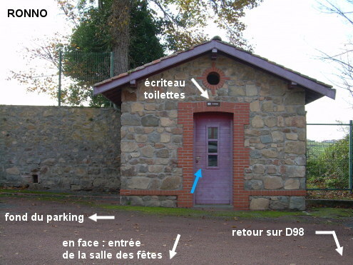 Ces toilettes se trouvent sur le parking de la salle des fêtes (suivre la flèche ''P'') qui est derrière son bâtiment qui n'est pas identifié côté D98. 1) En provenance de Valsonne et du col du Pilon sur la D313 (à grande circulation, mais il y a une bande cyclable dans le sens de la montée) puis la D98, attention au carrefour en Y peu avant le village : ne pas aller tout droit mais virer à gauche, la flèche D98 est plutôt petite. Entrer dans le village et surveiller attentivement le côté gauche (c'est en descente) pour repérer peu après le grand bâtiment en pierres et tourner alors à gauche dans l'accès au parking juste avant un cabanon en briques rouges à toit pointu situé au milieu d'une haie arbustive (si on voit à droite le portail monumental de l'entrée du parc du château, c'est qu'on est allé trop loin !). Continuer vers le parking à gauche pour trouver côté droit (face à l'entrée de la salle des fêtes côté gauche) le petit bâtiment des toilettes. N.B. : Il y a un grand évier avec deux robinets surmontés d'un écriteau ''eau potable'', et deux urinoirs, mais la porte qui était probablement celle d'un WC est condamnée (constaté en décembre 2024). 2) En provenance d'Amplepuis sur la D313 (à grande circulation mais avec bandes cyclables) puis la D56 et enfin la D98, peu après un virage à droite et l'église érigée côté gauche, au sortir d'une courbe à droite (en montée) tourner à droite juste après le cabanon à toit pointu qui sert de point de repère, et avant le grand bâtiment en pierres en suivant la flèche indiquant un parking. Puis se diriger vers le parking sur la gauche, pour trouver les toilettes côté droit.