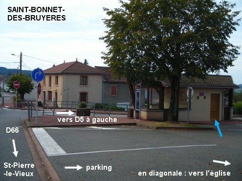 Les toilettes sont situées au bord d'une immense place proche de l'église. En provenance de Saint-Pierre-le-Vieux sur la D66, à l'endroit où celle-ci arrive en face du sens interdit de la rue de la Poste et où il faut virer à droite, tourner juste avant sur le parking à droite. Le petit bâtiment qui comporte les toilettes et un abribus est à l'entrée du parking côté gauche. N.B.: A partir de la D5, en provenance de Monsols, au rond-point tourner à droite en direction de Saint-Pierre-le-Vieux (D66) dans la rue de la Poste. Quelques mètres plus haut, juste après l'intersection à gauche, tourner à gauche sur le parking précité. Dans l'autre sens, en provenance d'Aigueperse, on voit avant le rond-point précité une flèche à gauche indiquant Saint-Pierre-le-Vieux, on peut la suivre, puis face à la rue de la Cure qui descend en sens unique depuis l'église, poursuivre à droite le long de la place et juste après le carrefour en T à gauche, entrer à gauche sur le parking.