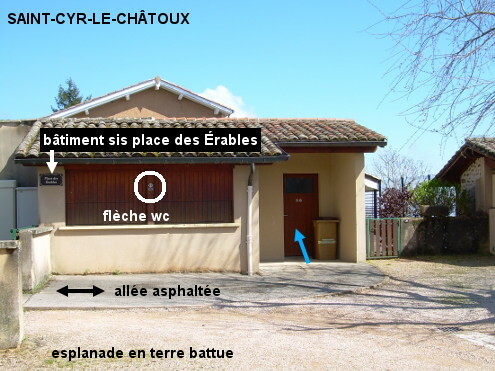 Ces toilettes se trouvent au fond d'une petite place piétonne, située au bord d'une rue adjacente à la D44A débutant à côté de l'église et menant à la Mairie. N.B. : Le lavabo est relativement petit. En provenance de Lamure-sur-Azergues et du col de la Croix Montmain sur la D44 (au carrefour avec la D504 au lieu-dit Le Parasoir, faire droite / gauche pour prendre la D44A en direction du village) puis la D44A, juste avant l'église érigée côté gauche tourner à gauche en direction de la Mairie. Avant celle-ci entrer à droite sur la petite place piétonne bordée d'un muret : une allée en macadam passe devant un petit bâtiment sur lequel une minuscule flèche pointe vers les toilettes et conduit à la porte des toilettes. P.S. : En repartant, si on continue dans la D44A, elle débouche sur la D504 au niveau du carrefour avec la D20 en direction du col de Saint-Bonnet et avec la D49E direction Vaux-en-Beaujolais, mais si on arrive de l'une de ces routes, on ne peut pas prendre la D44A à cet endroit car c'est en sens interdit.