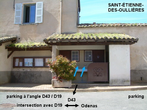 Ces toilettes se trouvent au fond du parking situé à l'angle de la D43 direction Odenas et de la D19 direction Salles-Arbuissonnas. Elles disposent d'un grand évier extérieur avec deux robinets. 1) Sur la D19 en provenance de Belleville-en-Beaujolais, à l'intersection avec la D43 on verra sur la droite derrière la D43 le parking précité dont l'entrée donne sur la D43. Le bâtiment des toilettes est accolé au mur du fond du parking. 2) Sur la D19 venant de Salles-Arbuissonnas, au carrefour près de l'église tourner à droite dans la suite de la D19 et peu après tourner à gauche dans la D43 direction Odenas puis entrer aussitôt à gauche sur le parking à l'angle pour trouver les toilettes en face contre le mur du fond.