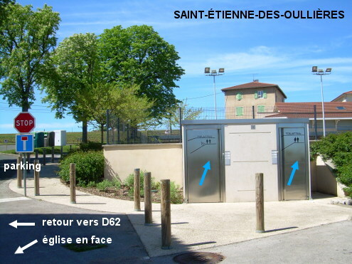 Ces toilettes se trouvent derrière l'église, à proximité de l'aire de covoiturage (fléchée). Il s'agit de toilettes automatiques avec deux cabines chacune équipée d'un lavabo muni d'une cellule à détection pour déclencher l'écoulement de l'eau. N.B. : Elles sont concernées par une fermeture nocturne de 22h à 6h. 1) En provenance de Saint-Étienne-la-Varenne sur la D62, tourner à gauche juste avant l'église en suivant la flèche ''aire de covoiturage'' (celle-ci est ensuite sur la gauche). Les toilettes sont alors en face de cette allée, à 25 mètres de la D62. 2) Sur la D19 en provenance de Belleville-en-Beaujolais, à l'intersection avec la D43 continuer tout droit (on voit déjà l'église), peu après laisser la suite de la D19 qui part à gauche en direction de Salles-Arbuissonnas, à l'opposé de l'église qui est à droite derrière la rue adjacente. Là, on peut soit longer la droite de l'église, soit continuer sur la route pour prendre ensuite à droite après l'église l'allée qui dessert l'aire de covoiturage, et arriver ainsi jusqu'aux toilettes.