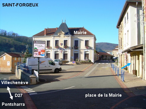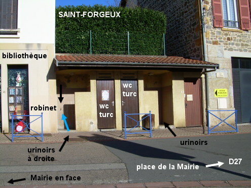 Ces toilettes se trouvent à proximité de la Mairie et à 10 mètres de la D27. 1) En provenance de Pontcharra sur la D27, au carrefour en Y où la D27 continue sur la gauche en descendant un peu et où la rue tout droit dessert la Mairie sise côté gauche face à la place en surplomb de la D27 et dans la fourche du carrefour, avancer à droite de 10 mètres pour trouver les toilettes côté droit dans le bâtiment après le numéro 16 et avant la bibliothèque. Il y a deux espaces avec urinoirs de part et d'autre des deux cabines WC turcs, et dans celui de gauche on trouvera un robinet sur le mur face à l'entrée. 2) En provenance de Villechenève sur la D27, longtemps après le carrefour à droite avec la D632 (la flèche est orientée pour ceux qui roulent en sens inverse), juste après le carrefour en Y où la D27 monte un peu sur la branche de gauche, on verra la Mairie en surplomb côté gauche (sa façade avant est orientée face au sens inverse), tourner alors en épingle à gauche pour trouver ensuite les toilettes aussitôt à droite au début de la ''place de la Mairie''.