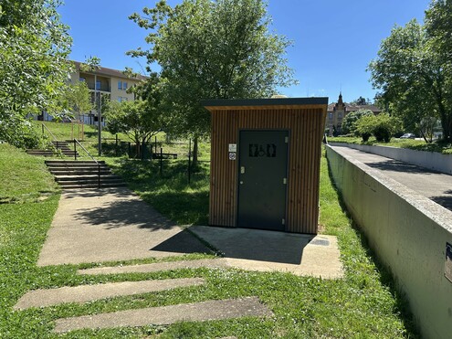 Des WC se trouvent à côté de la zone de jeux pour enfants. Un robinet se trouve à 10m des WC, sous les arbres.