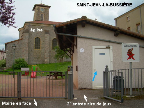 Les toilettes se trouvent sur l'aire de jeux située entre l'église et la Mairie, qui est au bord de la D308 qui traverse la ville. En provenance d'Amplepuis sur la D308 (route à grande circulation), juste après l'église érigée côté gauche (une flèche indique la présence d'un WC), traverser la route et entrer à pied dans l'aire de jeux. Parcourir en diagonale l'aire de jeux (40 mètres en terre battue) vers la gauche jusqu'au bâtiment dans le coin à côté de l'autre portillon. Ledit bâtiment est composé d'une partie abritée en regard de l'arrière de l'église, et des toilettes dont la porte est située côté opposé, face à la Mairie sise sur la place Antonin Goujat qui est devant la deuxième entrée de l'aire de jeux et qui est accessible par une rue secondaire (rue Lamartine, débutant face à l'ancien cimetière) ou des escaliers (12 marches) depuis un parking en contrebas au bord de la D308. P.S. : La suite de la rue Lamartine rejoint la D308 devant l'église.