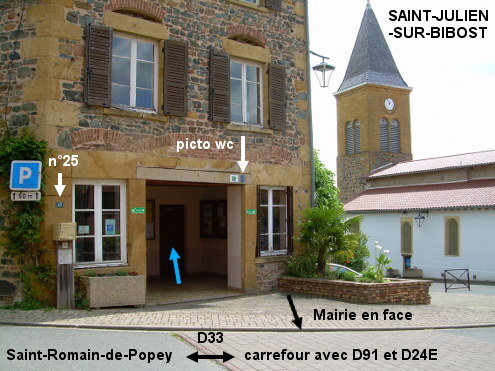 Les toilettes se trouvent dans le hall ouvert d'un grand bâtiment au bord de la D33 direction Saint-Romain-de-Popey situé en face de la Mairie et près de l'église. 1) En provenance de Saint-Romain-de-Popey sur la D33, dans une courbe en S on verra côté droit une croix puis la Mairie face à soi, c'est là que l'on découvrira le grand bâtiment côté gauche avec un rez-de-chaussée ouvert, un minuscule pictogramme toilettes au fronton côté droit, et au fond du hall une porte avec un petit écriteau ''WC''. N.B. : Ce sont de grandes toilettes avec un grand évier rectangulaire dans lequel on peut facilement remplir des grands bidons. 2) En provenance de Bessenay sur la D24 puis la D33, au carrefour à gauche avec la D24E1 venant de Montrottier, continuer tout droit à peine quelques mètres jusqu'au carrefour en Y avec la D91 qui tout droit va à Bibost. Prendre sur la branche gauche la suite de la D33 en direction de Saint-Romain-de-Popey. Plus loin, à l'entrée d'une courbe en S inversé, on découvrira l'église en retrait en face sur la droite, une école à sa gauche, et en tournant bien le regard côté gauche on verra la Mairie et ses drapeaux (face au sens opposé de circulation). C'est à cet endroit, face à la Mairie, qu'est situé côté droit le bâtiment à l'intérieur duquel il y a les toilettes au fond du hall.
