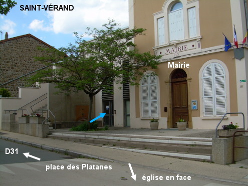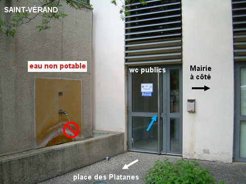 L'entrée des toilettes se trouve à gauche de la Mairie, dans le même bâtiment, à proximité de l'église, et à 30 mètres de la D31. 1) En provenance de Ternand sur la D31, au carrefour au milieu duquel il y a une zone pavée, tourner à gauche. On voit alors l'église érigée côté droit derrière une grande place. La Mairie est sise côté gauche presque en regard de l'église. Traverser, monter les deux marches pour accéder au petit parvis devant la Mairie. La porte des toilettes bien identifiée est à gauche de l'entrée de la Mairie. Elles comportent deux parties avec chacune un lavabo qui est toutefois trop petit pour remplir un bidon (on peut néanmoins se désaltérer en cas de panne sèche). ATTENTION : ne pas boire l'eau de la fontaine qui est contre le mur de gauche avant les toilettes, son eau est non-potable. 2) En provenance de Dareizé sur la D31, peu après le début du village, au carrefour en Y (avec une croix dans sa fourche) rester sur la ''route Fleurie'' qui est la D31 (branche de gauche). On arrive ensuite sur le carrefour multi-branches avec la zone pavée et où l'on voit l'église sur la droite derrière une grande place. Tourner à droite (mais pas dans la plus à droite) dans la rue qui passe à gauche de l'église et avant celle-ci s'arrêter à gauche devant la Mairie pour trouver les toilettes.