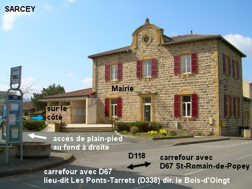 Les toilettes sont accolées à gauche du bâtiment de la Mairie qui est située à côté de la D118, sur sa portion où elle se superpose à la D67. 1) En provenance du lieu-dit Les Ponts-Tarrets sur la D338 (portion de 1,3 km sur cette route à très grande circulation) puis la D67, celle-ci se superpose à la D118 qui arrive de la gauche (en provenance de St-Germain-sur-l'Arbresle par la D19 puis la D118). Plus loin et juste après l'arrêt de bus, entrer à gauche sur le parking devant la Mairie et se diriger vers le fond puis vers la droite pour accéder de plain-pied (sans passer par les escaliers) à la porte des toilettes qui est sur le pignon gauche de la Mairie (à 35 mètres de la route). N.B. : En plus du lavabo intérieur, il y a un robinet-vanne à l'extérieur à gauche de la porte des toilettes (son eau est coupée en hiver). 2) En provenance de Saint-Romain-de-Popey sur la D67, au carrefour en T avec la D118 tourner à droite puis juste après entrer à droite sur le parking avant l'arrêt de bus et se diriger vers le fond puis vers la droite pour accéder à la porte des toilettes sur le côté gauche de la Mairie (dont la façade avant fait face au sens opposé de circulation sur la D118 superposée à la D67).