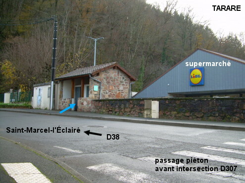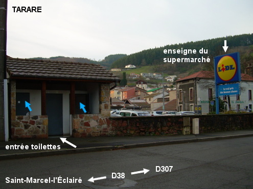 Le bâtiment de ces toilettes est implanté côté droit au début de la D38 qui monte vers Saint-Marcel-l'Éclairé, à côté du parking d'un supermarché facile à repérer, situé dans l'angle de la D38 et de la D307. 1) En provenance de Saint-Clément-sur-Valsonne sur la D107 (éventuellement via le raccourci sur la D56E passant au col de la Croix-Paquet), au rond-point avec la D8 qui arrive sur la droite des Sauvages, tourner à gauche (dernière sortie) dans la D8 en direction du centre-ville. Continuer tout droit (dont un rond-point) pendant un moment jusqu'aux feux tricolores du carrefour avec une partie de la D307 (en centre-ville elle est scindée en deux rues à sens unique inverses). Tourner à droite dans la D307 (direction Roanne) puis à la fin de cette partie en sens unique, tourner à gauche (pré-file direction ''Saint-Marcel''): c'est l'autre partie, en sens inverse, puis au carrefour suivant aussitôt après, tandis que le sens unique de la D307 (ex-RN7) part à gauche en direction de Lyon, prendre tout droit la D38 direction Saint-Marcel-l'Éclairé. Le bâtiment des toilettes est sur la droite au bord de la route à peine quelques mètres après. 2) En provenance de Saint-Marcel-l'Éclairé sur la D38, au bas de la descente juste avant le carrefour avec la D307 on verra côté gauche le bâtiment des toilettes (à côté du parking d'un supermarché dont l'enseigne sur un mât est bien visible). P.S. : Pour rejoindre la D107 direction St-Clément-sur-Valsonne, suivre le sens obligatoire à droite dans la D307 puis tourner à gauche aux feux tricolores (en direction de la Gendarmerie, on passera devant) : c'est la D8 et continuer tout droit jusqu'au deuxième rond-point où on aura la D107.
