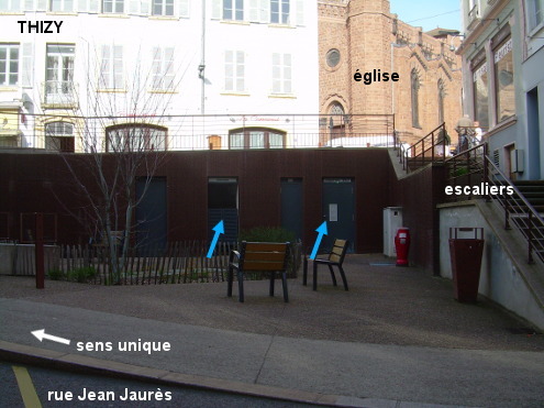 Les toilettes se trouvent sur une placette dans la fourche d'un carrefour en centre-ville situé non loin de l'église. 1) En provenance de Saint-Jean-la-Bussière (sur la D308 à la sortie du village, pour éviter la route à grande circulation, juste après la route adjacente à droite en direction du site panoramique de la Madone, tourner à droite : on aperçoit le panneau de fin de village sur la D504) sur la D504, à l'approche de Thizy au carrefour en T tourner à droite (c'est la suite de la D504) pour entrer dans Marnand qui fait partie comme Thizy de la commune regroupée de Thizy-les-Bourgs. Rouler tout droit pendant un moment, passer à côté de la Gendarmerie, plus loin au débouché d'une rue en sens unique bordée d'immeubles on aura sur la droite la placette au fond de laquelle se trouvent les toilettes, dans le mur de soutènement de la rue presque parallèle qui rejoint le carrefour (on aperçoit l'église en arrière-plan). 2) En provenance de Mardore sur la D604 (à la sortie du village prendre la route à droite au début de laquelle il y a la borne kilométrique du km 0 de la D604), après le panneau marquant le début de Thizy, au carrefour en T tourner à gauche (c'est la D504). Rouler tout droit jusqu'à déboucher, peu après l'église érigée sur la gauche, d'une rue bordée d'immeubles sur un carrefour à plusieurs branches. Là, tourner à gauche en direction de Marnand puis prendre à pied la branche droite du carrefour en Y pour accéder juste après à la placette côté gauche au fond de laquelle se trouvent les toilettes. 3) En provenance de Saint-Vincent-de-Reins sur la D9, après avoir contourné par la gauche le sens interdit en face duquel on est arrivé, tourner à droite pour arriver vers la placette comme au point 1. P.S. : En repartant, si on prend en face la rue sur la gauche (rue Perrin Frères) et si on tourne aussitôt à gauche : on sera sur la D9 qui va à Bourg-de-Thizy, autre commune incluse dans Thizy-les-Bourgs.