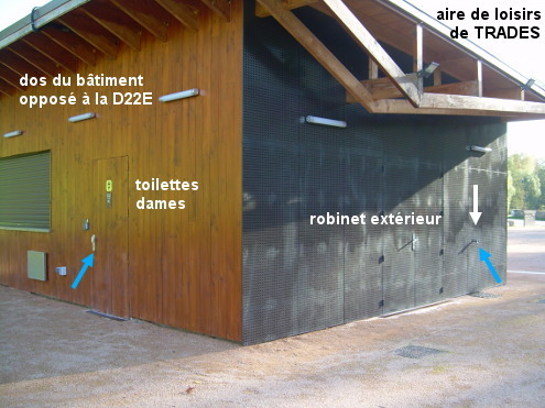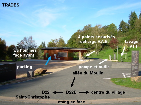 Ces toilettes se trouvent dans le grand bâtiment de l'aire de loisirs située près de l'étang vers la sortie du village en direction de Saint-Christophe-la-Montagne. 1) En provenance de Saint-Christophe-la-Montagne sur la D22 (ou de Saint-Léger-sous-la-Bussière sur la D322 qui devient D22) puis sur la D22E, 290 mètres après le panneau de début de village, au niveau de l'étang situé côté droit et juste après le passage piéton, tourner à gauche dans l'allée du Moulin qui dessert l'Île aux Loisirs. Le grand bâtiment habillé de bois (très récent) de la Maison de la Convivialité est situé à gauche de l'allée à 40 mètres de la D22E. On trouvera, sur sa face avant sur la gauche la porte des toilettes hommes (avec lavabos), sur sa face arrière la porte des toilettes pour les femmes, et sur le côté gauche un robinet extérieur. N.B. : Il y a aussi sur le côté droit du bâtiment quatre points de recharge sécurisés pour vélos à assistance électrique, et à droite de l'allée du Moulin : un poste de dépannage support atelier avec pompe et quelques outils, et avant celui-ci un poste de lavage pour VTT. 2) En descendant du col de la Croix de l'Orme sur la D22E, après avoir traversé le village, vers la fin de la descente, dans l'intérieur d'une large épingle à droite, entrer sur l'aire de loisirs pour trouver le bâtiment qui abrite les toilettes.
