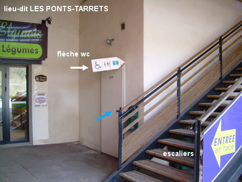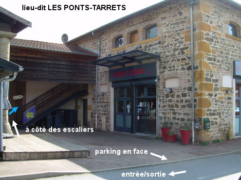 Les toilettes se trouvent dans un recoin du petit espace commercial installé sur le grand îlot rectangulaire situé entre les deux bras de la D385 dans ce lieu-dit. En provenance de Sarcey sur la D67 puis la D338 (environ 1,3 km de cette route à très grande circulation), après un premier rond-point sur lequel arrive la D313 (à grande circulation) en provenance de Saint-Clément-sur-Valsonne, au deuxième rond-point juste après : suivre le sens obligatoire à droite. Deux options sont alors possibles. 1a) Faire le tour du grand îlot situé côté gauche : au rond-point à la fin de cette partie, prendre la dernière sortie pour rouler sur l'autre partie en sens inverse et unique de l'autre côté de l'îlot, et juste avant le carrefour en Y à sa fin : entrer à gauche sur le parking. Avancer de quelques mètres en longeant les bâtiments qui sont à gauche puis entrer à pied dans le renfoncement entre deux bâtiments (une épicerie et une boulangerie), on aperçoit alors une grande flèche blanche pointant vers les toilettes. La porte des toilettes se trouve à droite dans le recoin après le début des escaliers. N.B. : Elles sont dotées d'un grand évier rectangulaire permettant de remplir des grands bidons. 1b) Au lieu de faire le tour complet de l'îlot pour accéder à l'entrée du parking, à vélo on peut traverser sur le passage piéton pour rejoindre l'espace devant les commerces en empruntant le cheminement piéton le long de la boulangerie. P.S. : Pour repartir sur des routes à faible circulation, au carrefour en Y à côté de l'entrée/sortie du parking, prendre à droite 110 mètres de D385 direction Lamure-sur-Azergues puis tourner à droite dans la D120 direction Val d'Oingt (Le Bois-d'Oingt).