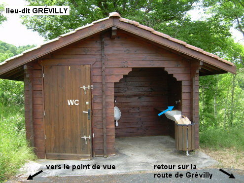 Le chalet des toilettes se trouve près du belvédère de Grévilly (fléché), non loin de la chapelle éponyme, sur les hauteurs de la commune de Saint-Forgeux, à 90 mètres de la petite route entre Saint-Forgeux et Saint-Marcel-l'Éclairé. À partir de la D27 dans Saint-Forgeux, prendre la ''montée du Château'' à côté de l'église (qui est en surplomb de la D27), la flèche brune indiquant la direction de la chapelle de Grévilly est plantée quelques mètres après le début de la rue (elle est en partie masquée par de la végétation). Comme son nom l'indique, cette rue monte, et cela de manière soutenue. Virer ensuite à gauche en suivant le fléchage. Attention : peu après il n'y a plus de flèche et il ne faut pas continuer tout droit (rue Cotton) mais prendre la branche droite du carrefour. Ensuite c'est toujours tout droit en continuant à monter. Sur le replat au sommet et après les habitations du lieu-dit on rencontrera d'abord l'allée qui dessert à droite la chapelle de Grévilly, puis côté gauche l'allée qui monte jusqu'au parking avant la table d'orientation et l'aire de pique-nique (fléchées). À la fin du parking, poursuivre sur le chemin piétonnier (interdit aux véhicules par un potelet), asphalté lui aussi, et monter jusqu'au chalet implanté à droite du chemin qui à cet endroit vire en épingle à gauche pour desservir un peu plus haut un espace avec tables de pique-nique dans l'herbe et la table d'orientation avec point de vue sur le panorama environnant (à 80 mètres du chalet, dont 40 sur l'herbe). N.B. : Dans la partie droite du chalet ouverte sur l'extérieur, il y a un grand évier permettant de remplir des grands bidons. P.S. : Pour rejoindre le village de Saint-Marcel-l'Éclairé, continuer sur la petite route puis au carrefour en T en bas (presque sous le viaduc de l'autoroute) tourner à gauche : c'est la D38E1 direction Saint-Marcel-l'Éclairé (en sens inverse, il y a bien une flèche ''chapelle de Grévilly'', et deux pour Saint-Forgeux).