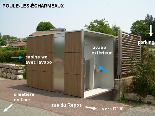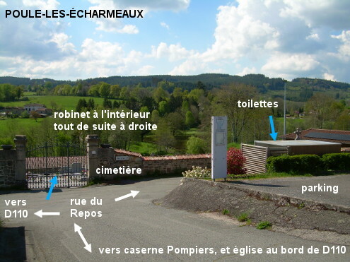Les toilettes se trouvent en face du cimetière, non loin de la Mairie (fléchée), à 140 mètres de la D110. 1) En provenance du lieu-dit Lafont (prendre la ''route de Lafont'' qui est presque en face de l'allée montant vers son cimetière, en suivant l'ancienne flèche ''Poule-les-Écharmeaux'') sur une petite route en suivant le fléchage d'un itinéraire cyclo (au carrefour en T sans flèche vers le début du village, tourner à gauche et passer à côté de la croix de Germolière pour retrouver le balisage), on débouche en T sur la D110 qui traverse le village : tourner à gauche. Ensuite on peut tourner à droite soit avant (flèche ''Mairie'') soit après l'église (flèche ''WC'') pour arriver sur la place au fond de laquelle il y a la caserne des Sapeurs-Pompiers. Passer à droite de la caserne puis tourner aussitôt à gauche et ignorer l'allée à droite conduisant à la Mairie (il y a ensuite une aire de jeux côté droit). Descendre jusqu'à arriver en face du portail du cimetière. 1a) Le robinet du cimetière est à l'intérieur, à droite du portail. 1b) Les toilettes sont à droite dans l'angle du carrefour en T entre la rue d'où l'on vient et celle passant devant le cimetière. Sur le côté gauche du petit bâtiment des toilettes il y a une cabine WC autonettoyante dotée d'un lavabo avec un robinet à bouton-poussoir, qui est concernée par une fermeture nocturne de 22h à 6h. Sur le côté droit, derrière un paravent en lattes de bois, il y a un lavabo extérieur à côté des urinoirs. P.S. : Si on repart dans la rue du Repos à gauche du cimetière, on débouchera sur la D110 et à droite on pourra continuer sur un itinéraire cyclo sur des petites routes en direction du col des Aillets. 2) En provenance du col des Écharmeaux sur la D337 puis la D110, tourner à droite soit juste avant soit juste après l'église comme au point 1 pour accéder au cimetière.