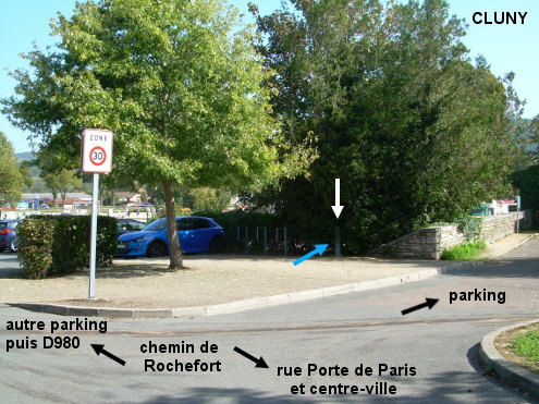 Cette borne Bayard se trouve entre deux parkings situés à côté de manèges équestres et à proximité de la tour Fabry (à toit très pointu). N.B. : Il faut tourner pendant longtemps le dessus de la borne pour faire couler l'eau. 1) Sur la D981 en provenance de Massilly, au rond-point avec la D980 continuer tout droit en direction du centre-ville (deuxième sortie, rue Porte des Prés). Puis au carrefour près de la tour Fabry, tourner à gauche (chemin de Rochefort) avant un premier parking. Ensuite, juste après un accès sur la droite à ce parking, on verra un panneau ''zone 30'' au bord d'une courte partie surélevée comme un trottoir séparant les deux parkings, avant que le chemin de Rochefort ne mène au deuxième parking puis à la D980. À hauteur de ce panneau, à droite contre un endroit boisé on découvrira la borne à l'ombre des arbres. 2) En provenance de Jalogny sur la D465, tourner à gauche dans la D980 (route à très grande circulation), puis plus loin en face du carrefour à droite avec la D15 (on ne voit que la borne au ras du trottoir au début du petit pont sur la rivière) tourner à gauche dans la rue en sens unique (rue de la Levée) puis dans la première à droite (rue Porte de Paris). Continuer tout droit au-delà de la tour ronde (le contresens est autorisé aux vélos), la rue est alors longée à droite par des manèges pour chevaux. Quand on arrive en vue d'une deuxième tour, à toit très pointu, prendre la deuxième entrée dans le parking à droite (celle en face du passage piéton) et avancer jusqu'au fond (35 mètres) pour trouver la borne Bayard sur le ''trottoir'' à gauche du muret et vers les supports pour stationner des vélos.