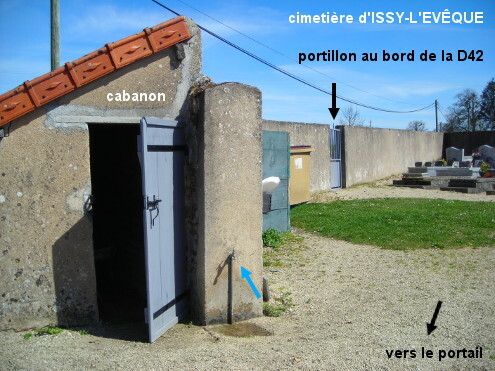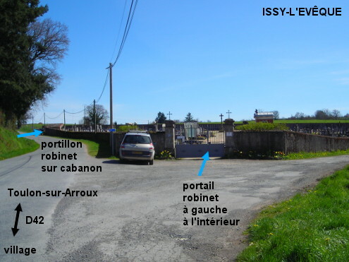 Le cimetière est situé en dehors du village. Il est implanté côté droit, 130 mètres après le panneau de fin de village, sur la D42 en direction de Toulon-sur-Arroux. Il comporte deux entrées et deux robinets. 1) Si l'on entre par le portail qui nous fait face, on trouvera le premier robinet à l'intérieur à gauche de ce portail vers le coin. 2) Si l'on entre plus loin par le portillon qui donne sur la route et dans l'autre partie du cimetière, on trouvera le deuxième robinet sur un mur du cabanon qui est sur la droite.