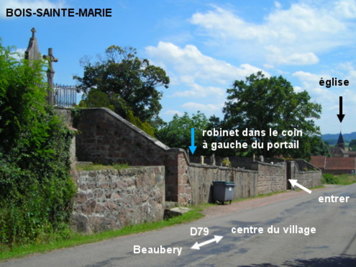 Le cimetière est situé à la sortie du village, côté droit sur la D79 en direction de Beaubery. Le robinet est à l'intérieur du cimetière dans le coin avant gauche (via une allée gravillonnée de 20 mètres).