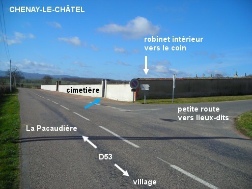 Le cimetière est implanté côté droit à la sortie du village (260 mètres après le panneau de fin), sur la D53 en direction de La Pacaudière, à l'angle derrière une petite route qui mène au lieu-dit La Prôte. Entrer par le portillon (vers l'extrémité droite du mur d'enceinte) et se diriger vers la droite, le robinet est au début du mur de droite près du coin.
