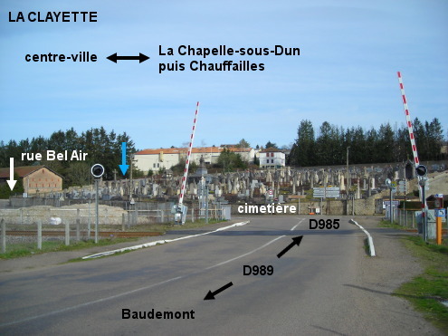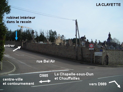 Le cimetière est situé à proximité de la gare, face au carrefour D989 / D985, à l'entrée sud de la ville. 1) Sur la D989 en provenance de Baudemont, juste après le passage à niveau et le panneau marquant l'entrée de la ville, on sera au carrefour en T avec la D985, face au cimetière. Pour accéder à son entrée, il faut tourner à gauche puis aussitôt à droite pour monter dans la rue Bel Air, le portail est situé à droite quelques mètres plus haut. Le robinet est à l'intérieur du cimetière, à gauche du portail, dans un renfoncement. 2) En provenance de La Chapelle-sous-Dun sur la D987 qui rejoint la D985 venant de Chauffailles, un moment après le panneau marquant le début de la ville et juste après le carrefour à gauche avec la D989, tourner à droite dans la rue Bel Air pour arriver au portail du cimetière. 3) En provenance du nord (Curbigny par la D193 ou Bois-Sainte-Marie par la D79) ou de l'est (Varennes-sous-Dun par la D987), contourner le centre-ville par la droite. A la fin du contournement, on verra la gare côté droit (actuellement jouxtée par un immense espace dégagé, en travaux) puis le cimetière côté gauche.