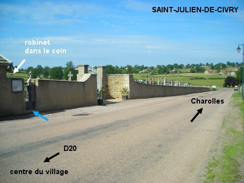 Le cimetière est situé à la sortie du village côté gauche sur la D20, en direction de Charolles. Le robinet est à l'intérieur du cimetière, à gauche du portillon qui est à l'extrémité gauche du cimetière.
