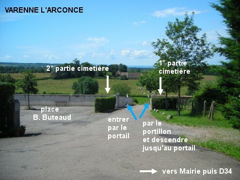Le cimetière est à 210 mètres de la D34. Sur la D34 en direction de Poisson, tourner à gauche juste après l'église (flèche "Mairie") puis à droite (flèches "Mairie" et "parking cimetière"). Passer sous l'arche puis devant la Mairie, la route forme une courbe à gauche puis tourner dans la première à droite. Côté gauche il y a une grande place bordée de haies, quelques mètres plus bas il y a de part et d'autre de la rue les deux parties du cimetière avec des drapeaux aux armoiries du village au niveau des portails. Il y a un robinet dans chacune des deux parties. Pour la partie la plus ancienne située à droite, entrer par le portillon, descendre l'allée à gauche le long du mur, le robinet est à la droite du portail (qui semble bloqué). Pour la partie la plus récente située côté gauche de la rue, entrer par le grand portail, le robinet est à l'intérieur à droite dans le recoin.