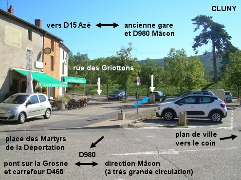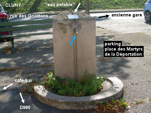 Ce robinet est fixé sur un support en pierre au milieu d'un parking situé au bord de la D980 à proximité de l'ancienne gare et du carrefour avec la D465 direction Jalogny. N.B. : La mention ''eau potable'' est presque effacée par le soleil. 1) Sur la D465 en provenance de Jalogny, au carrefour avec la D980, franchir à droite le grand pont sur la Grosne puis entrer aussitôt à gauche sur le parking (situé à côté d'un café-bar). Prendre l'allée la plus proche du bâtiment qui borde la place pour trouver le robinet proche de la rue des Griottons qui passe derrière la place des Martyrs de la Déportation. 2) Sur la D15 en provenance de Donzy-le-Pertuis, peu après le panneau de début de la ville, avant d'arriver sur la D980 (route à très grande circulation) et pour éviter celle-ci, tourner à gauche en direction de la Z.I. des Griottons. Continuer tout droit pendant environ 800 mètres puis avant que la route ne rejoigne la D980 à la sortie d'un virage à droite (sur la gauche il y a l'accès à l'ancienne gare) entrer sur le parking à droite. Passer derrière les emplacements de stationnement qui sont le long de la route pour revenir un peu vers les bâtiments à droite et trouver le support du robinet (qui est dos à la rue des Griottons d'où l'on vient). P.S. : À côté du panneau de signalisation de la D980, il y a sur ce parking un plan de la ville.