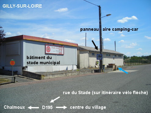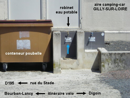 L'aire pour camping-car est située devant les bâtiments du stade municipal implanté à gauche d'une rue longeant la voie ferrée à droite et sur l'itinéraire vélo fléché entre Bourbon-Lancy et la halte nautique de Digoin, à 150 mètres de la D195. Sur la D195 en provenance de Chalmoux, juste avant le pont sous la voie ferrée, tourner à gauche dans la rue du Stade en suivant le balisage de l'itinéraire vélo. L'aire pour camping-car signalée par un panneau avec le pictogramme ad-hoc se trouve un peu plus loin. Le bloc avec les robinets est situé à droite de l'emplacement du grand conteneur poubelle. Le robinet de gauche est accompagné d'un écriteau ''eau potable'' (celui de droite, séparé par un muret en ciment, est destiné quant à lui au rinçage des cassettes des wc des camping-car).