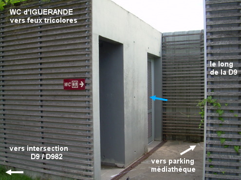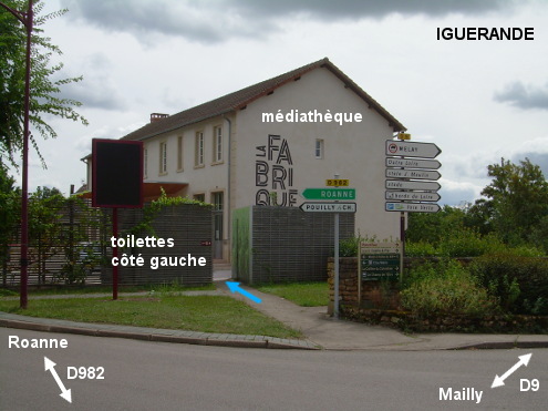 Ces toilettes se trouvent sur la droite du parking de la médiathèque, à l'angle de la D9 en direction du lieu-dit Outre-Loire et de la Voie Verte et de la D982 direction Roanne (route à très grande circulation), intersection protégée par des feux tricolores. Sur la D9 en provenance de Mailly, aux feux tricolores à l'intersection avec la D982, traverser en diagonale pour monter sur le trottoir et prendre l'allée oblique à gauche des panneaux de signalisation routière jusqu'au passage entre deux petits bâtiments : une flèche indique la présence des toilettes. L'entrée de la cabine WC se trouve dans ce passage qui rejoint le parking devant la médiathèque sur le pignon de laquelle est inscrit son nom en grosses lettres ''la fabrique'' (c'est là aussi qu'est hébergé le ''point info tourisme'' et un espace partagé de travail). N.B. : La porte des toilettes est la deuxième sur la gauche et son lavabo est trop petit mais il permet néanmoins de se désaltérer sur place.