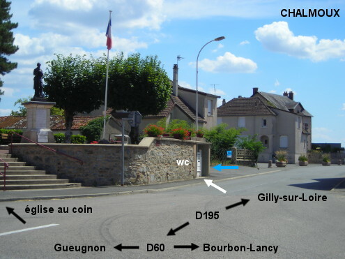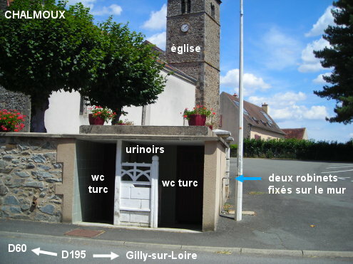 Les toilettes sont situées à proximité de l'église, à côté du carrefour D195 / D60. A ce carrefour (la D60 est une route à grande circulation), en direction de Gilly-sur-Loire par la D195, on verra sur la gauche l'église, le Monument aux Morts, et l'entrée des toilettes incluse dans un mur juste avant le parking implanté derrière l'église. Deux robinets extérieurs (un robinet-poussoir et un robinet-papillon) fixés sur une même arrivée d'eau se trouvent sur le mur droit du bâtiment des toilettes, côté parking.