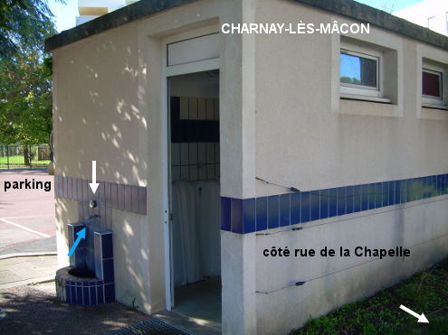Ces toilettes se trouvent à proximité de l'église au bord du parking sur lequel se tiennent les marchés, à 60 mètres de la D579. En provenance de Davayé sur la D54, au rond-point à l'intersection avec la D17, continuer tout droit dans la D354 en direction du centre-ville, au rond-point suivant tourner à droite dans la D579 en direction du centre-ville (le panneau n'est pas bien visible du fait de son orientation), au rond-point juste après l'église tourner à gauche. Peu après tourner à gauche entre deux parkings, le bâtiment des toilettes est sur la droite dans l'angle des deux rues. P.S. : Si on prend la suite de la D579 (Grande Rue de la Coupée, puis rue Rambuteau dans Mâcon) et que l'on continue tout droit jusqu'au carrefour en T, en tournant à droite (rue Victor Hugo) on arrivera au rond-point à côté de la gare SNCF de Mâcon.