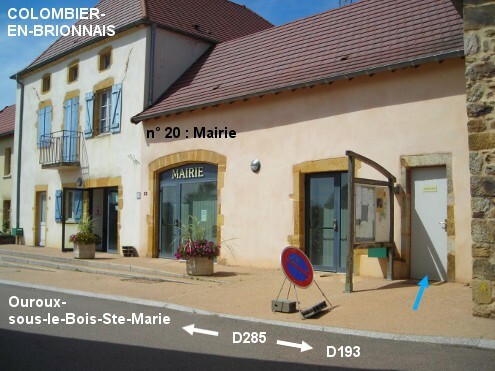 Les toilettes sont situées dans le même bâtiment que la Mairie, à droite de la Mairie. Celle-ci est implantée côté droit au début de la D285 direction Ouroux-sous-le-Bois-Sainte-Marie, juste après le carrefour avec la D193.