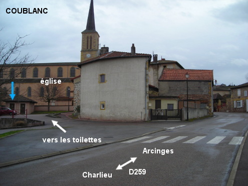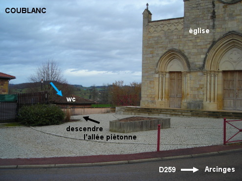 Les toilettes se trouvent tout au fond d'un parking et à gauche de l'église érigée au bord de la D259. 1) En provenance de Cadolon par la voie C8, juste après qu'elle a rejoint la D259 direction Arcinges à gauche, entrer à gauche sur le parking après l'abribus et se diriger vers la droite vers le fond en direction de l'église. Le petit bâtiment des toilettes est au fond dans le coin à gauche. 2) Sur la D259 en provenance d'Arcinges, on verra l'église dans l'intérieur d'un virage à droite (son entrée fait face au sens de circulation opposé). Entrer sur le parvis pavé devant l'église et se diriger vers la gauche de son portail pour prendre l'allée piétonne (dont l'accès est interdit aux véhicules par des potelets). Les toilettes sont alors côté droit un peu plus bas. N.B. : Le lavabo dans la cabine WC de la partie droite (hommes et handicapés) est trop petit, mais le lavabo qui est dans l'entrée de la partie gauche (dames) permet de remplir y compris des grands bidons.