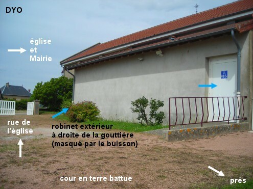 Les toilettes sont situées dans un bâtiment communal au fond d'une cour à proximité de la Mairie et de l'église. Lorsque l'on arrive dans le village en provenance d'Ouroux-sous-le-Bois-Sainte-Marie par la voie C1, on rejoint la D349 qui fait un angle droit au niveau de la Mairie et du Monument aux Morts. Tourner à droite dans la rue de l'église, celle-ci est implantée quelques mètres plus loin à droite, et sur la gauche juste après on voit une flèche "toilettes publiques" qui nous invite à entrer dans une cour dont le portail à lattes blanches est grand ouvert. Les toilettes sont au bout du bâtiment qui est au fond de la cour à gauche. En plus du lavabo intérieur, il y a un robinet extérieur au début du bâtiment des toilettes.