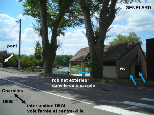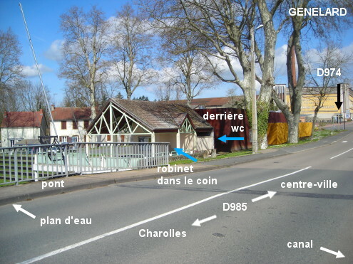 Les toilettes sont situées sur la halte nautique à l'entrée de la ville sur la D985 en provenance de Charolles. Peu après le panneau de début de ville et juste derrière le pont sur le canal, on verra côté gauche (face au n°11 avenue Jean Laronze) le grand bâtiment des toilettes au bord de la route et du plan d'eau formé par un élargissement du canal à cet endroit (nommé ''le port des pavés de Paris'' d'après un panneau d'infos touristiques), 50 mètres avant l'intersection avec la D974. L'entrée des toilettes est située sur le côté du bâtiment opposé au canal, à gauche il y a deux lavabos dans l'entrée et à droite il y a un robinet intérieur à droite de l'entrée. N.B. : Il y a aussi un robinet extérieur dans un coin carrelé face à la route sous la partie simplement abritée par une toiture qui est face au plan d'eau. Début avril, l'eau était déjà en service sur ce robinet tandis que l'accès des toilettes était encore grillagé en raison d'une fermeture hivernale.