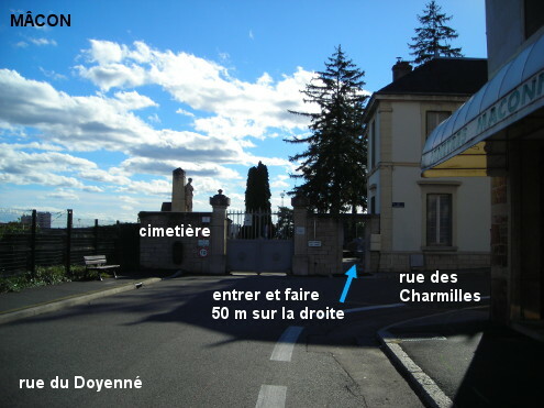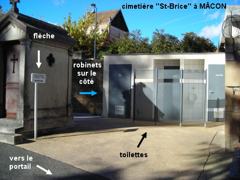 Ces toilettes sont à l'intérieur d'un des cimetières de la ville, celui dit ''Saint-Brice'' situé en centre-ville à 660 mètres de la gare SNCF. A partir de la gare ''Mâcon ville'' (différente de la gare TGV), au sortir de l'esplanade devant la gare tourner à gauche dans la rue Victor Hugo (en sens interdit mais le couloir de bus est autorisé aux vélos), puis dans la première à gauche (rue de la Crételle) et encore dans la première à gauche (rue du Doyenné). Au bout de cette dernière rue on sera devant l'entrée du cimetière qui est implanté derrière la rue des Charmilles qui débute sur la droite à angle droit. Entrer dans le cimetière et parcourir 50 mètres sur l'allée asphaltée à droite jusqu'à la flèche indiquant les toilettes qui sont en retrait sur la droite contre le mur. N.B. : Le lavabo dans la partie centrale où il y a les urinoirs est trop petit, mais il y a deux robinets à l'extérieur sur le côté gauche du bâtiment des toilettes.